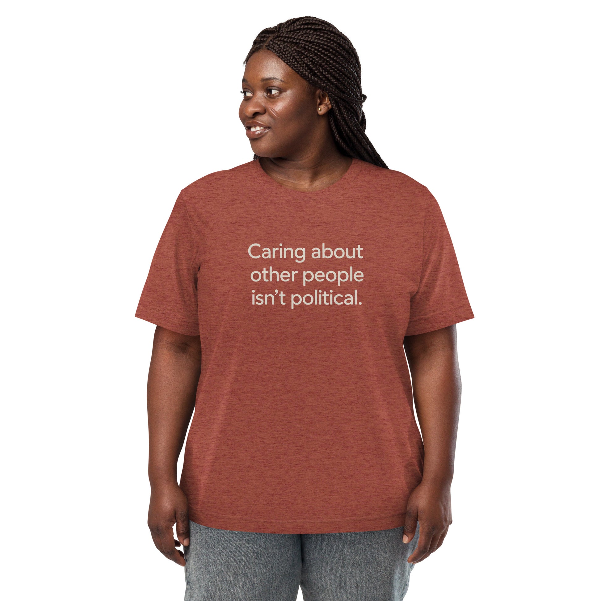 Make your voice heard with this bold Caring About Other People Isn't Political Short Sleeve Shirt— a must-have for anyone standing up against authoritarianism and fighting for democracy. The tri-blend fabric creates a vintage, fitted look. Extreme durability makes this t-shirt withstand repeated washings and still remain super comfortable. Pairs classic streetwear vibes with modern resistance. Available in XS-3XL