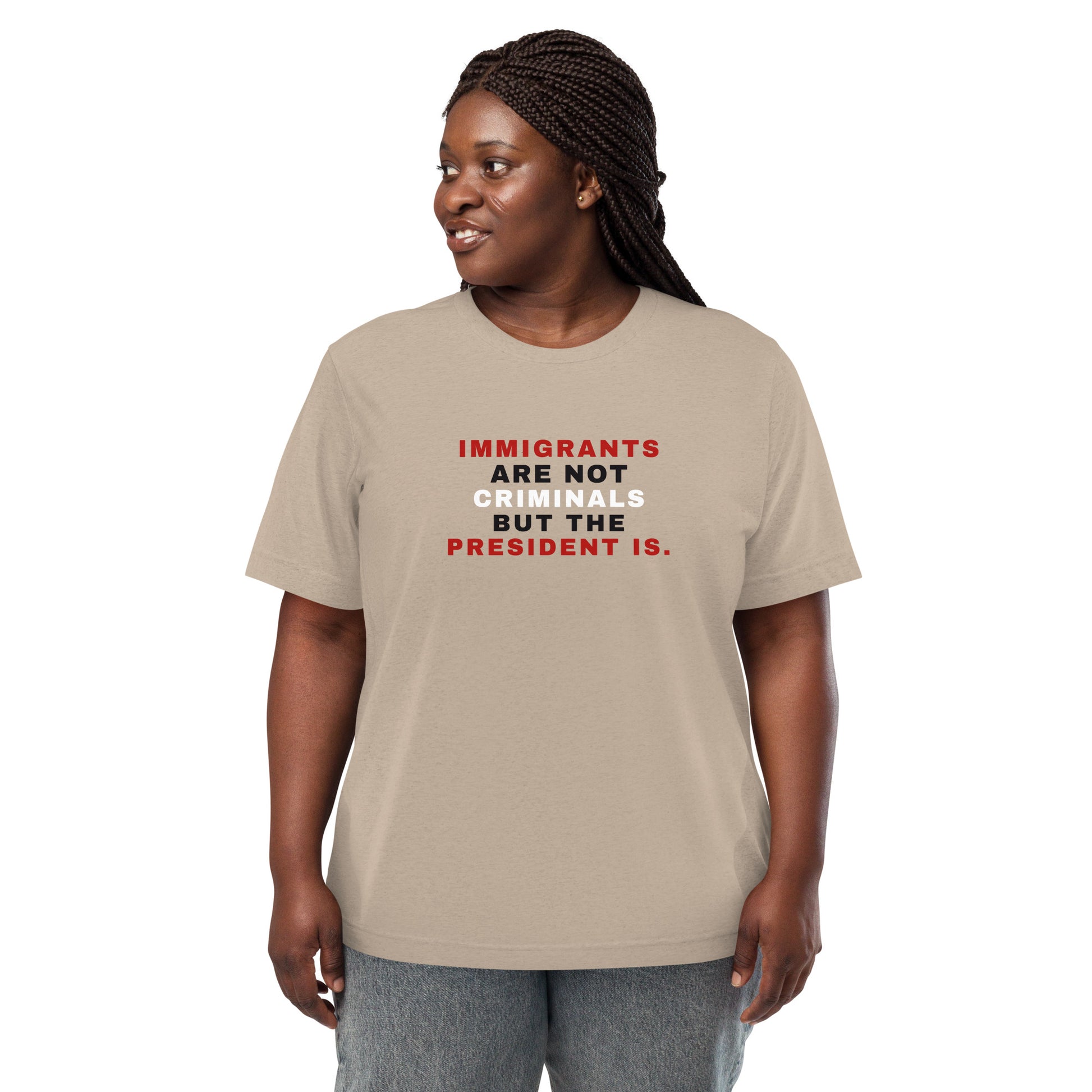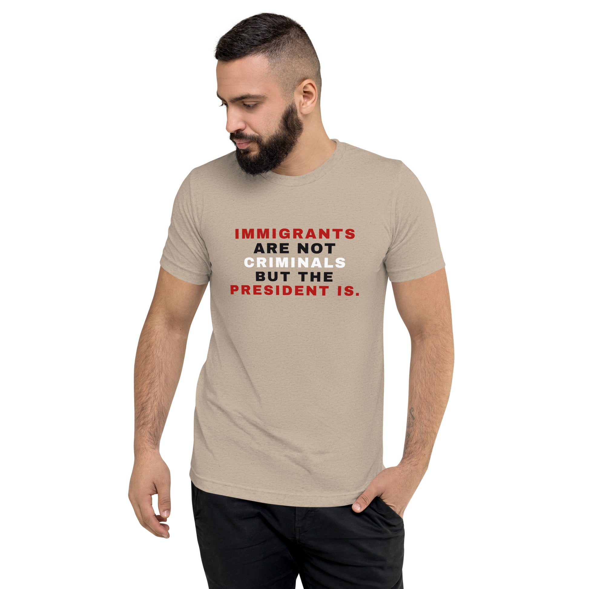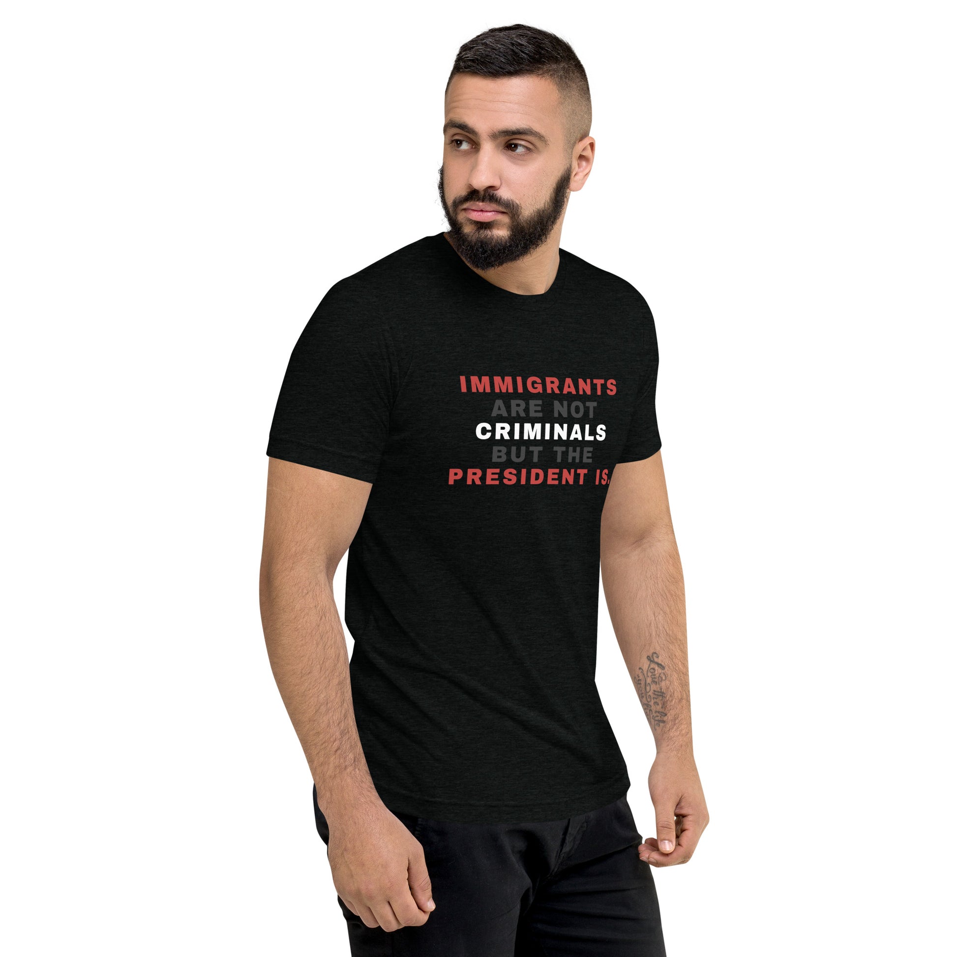 Make your voice heard with this bold Immigrants Are Not Criminals But The President IS Short Sleeve Shirt— a must-have for anyone standing up against authoritarianism and fighting for democracy. The tri-blend fabric creates a vintage, fitted look. Extreme durability makes this t-shirt withstand repeated washings and still remain super comfortable. Pairs classic streetwear vibes with modern resistance. Available in XS-3XL