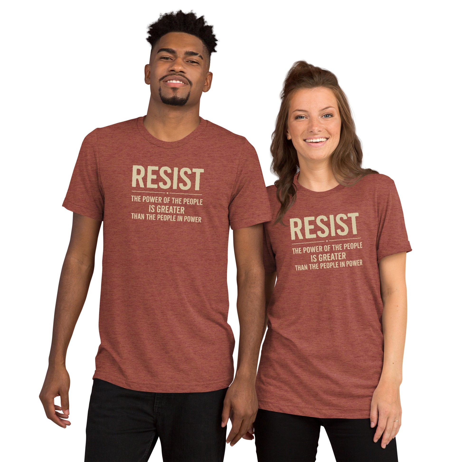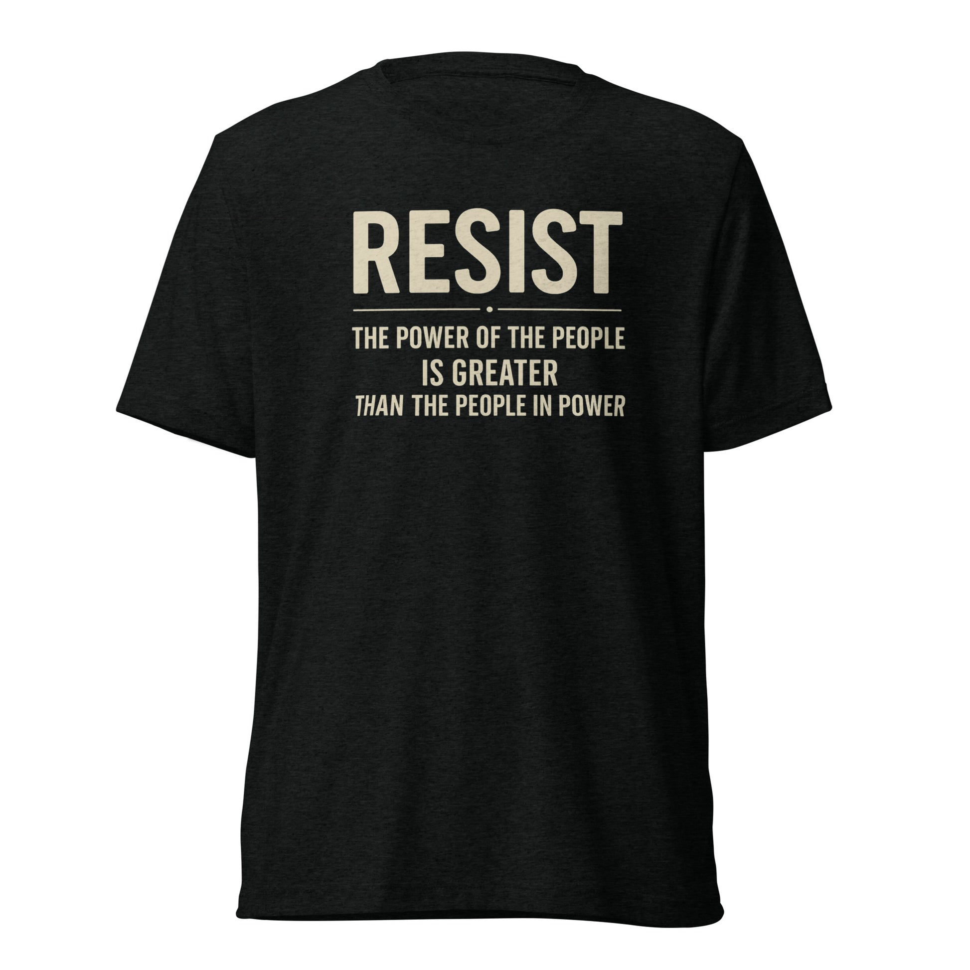 Make your voice heard with this bold RESIST: The Power Of The People Is Greater Short Sleeve Shirt— a must-have for anyone standing up against authoritarianism and fighting for democracy. The tri-blend fabric creates a vintage, fitted look. Extreme durability makes this t-shirt withstand repeated washings and still remain super comfortable. Pairs classic streetwear vibes with modern resistance. Available in XS-3XL