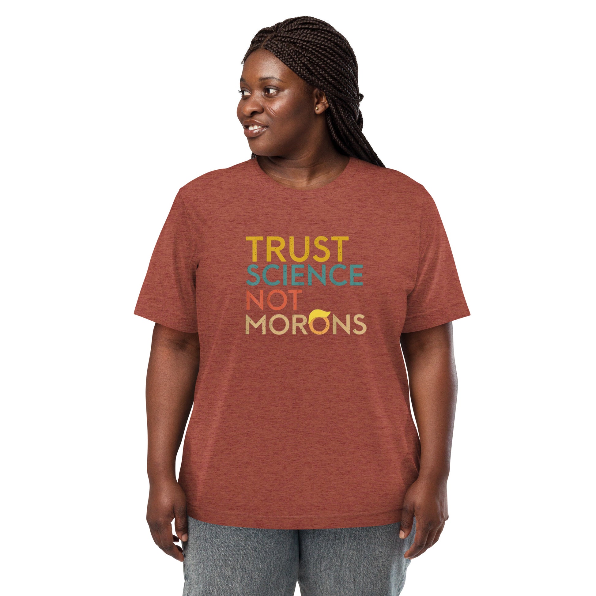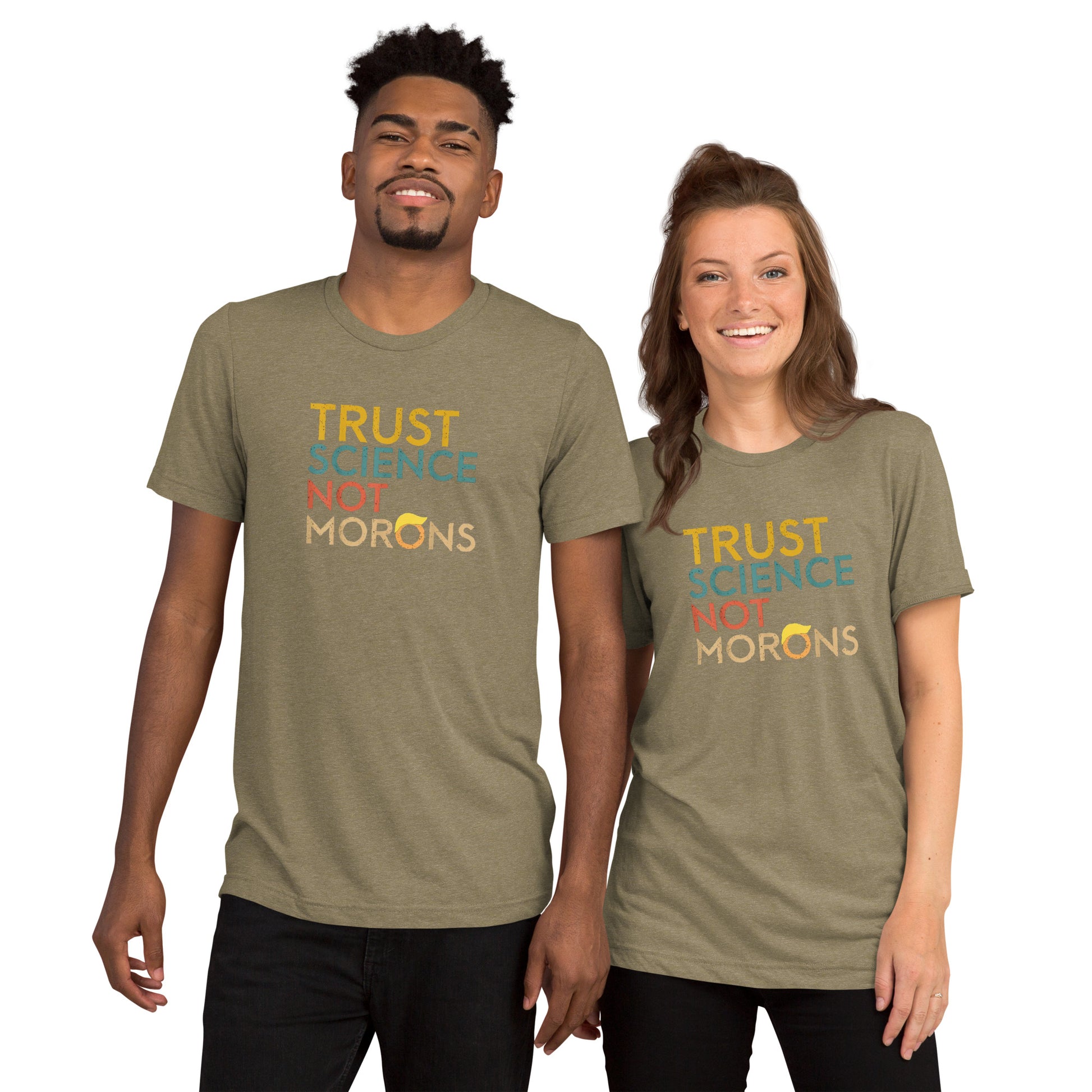 Make your voice heard with this bold Trust Science Not Morons Short Sleeve Shirt— a must-have for anyone standing up against authoritarianism and fighting for democracy. The tri-blend fabric creates a vintage, fitted look. Extreme durability makes this t-shirt withstand repeated washings and still remain super comfortable. Pairs classic streetwear vibes with modern resistance. Available in XS-3XL