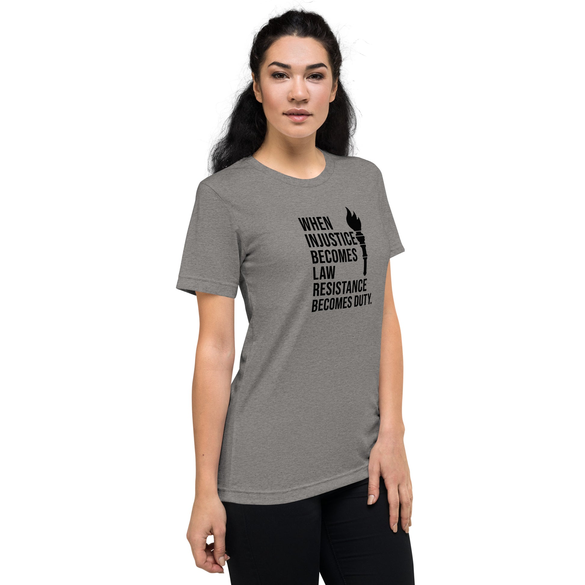 Make your voice heard with this bold When Injustice Becomes Law Torch Short Sleeve Shirt— a must-have for anyone standing up against authoritarianism and fighting for democracy. The tri-blend fabric creates a vintage, fitted look. Extreme durability makes this t-shirt withstand repeated washings and still remain super comfortable. Pairs classic streetwear vibes with modern resistance. Available in XS-3XL